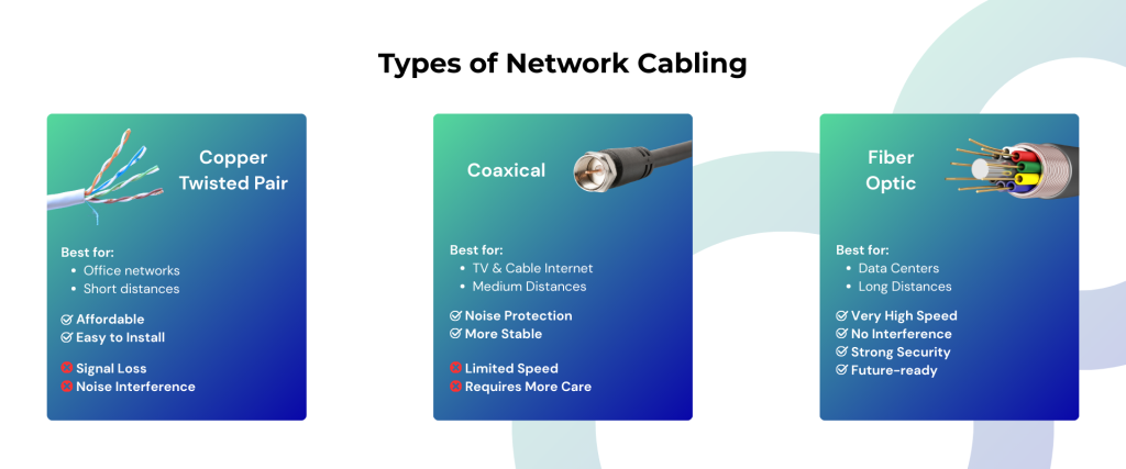 Cabling is the base of modern networks. It means the cables and links that move data between devices and places. These include fiber cables, copper cables, and coaxial cables. They carry voice, video, and data inside a business.